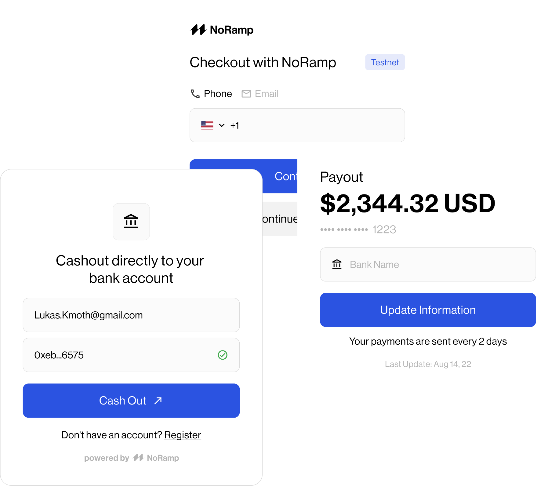 NoRamp enables your users to send and recieve fiat through our simple to use peer-to-peer fiat network.